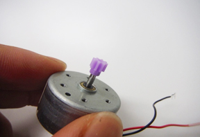 14:食品トレイから出ているギアとモーターのギアが噛み合うようにモーターをセロハンテープで付けます。